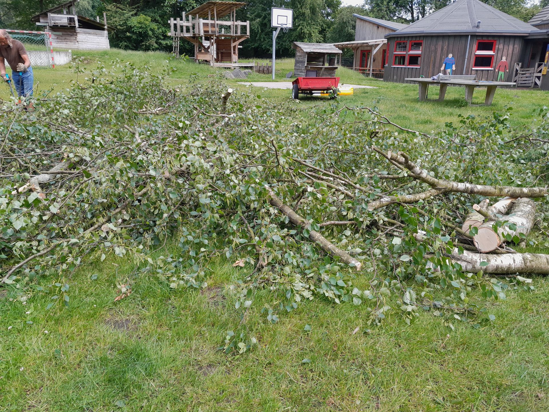 Eine Birke drohte auf unseren Platz zu fallen. Aus diesem Grund haben wir schnell den Baum von zuständigen Stellen prüfen lassen und ihn dann Anfang Juni gefällt. Eine große Aktion bei der uns unsere Honorarkräfte fleißig geholfen haben.