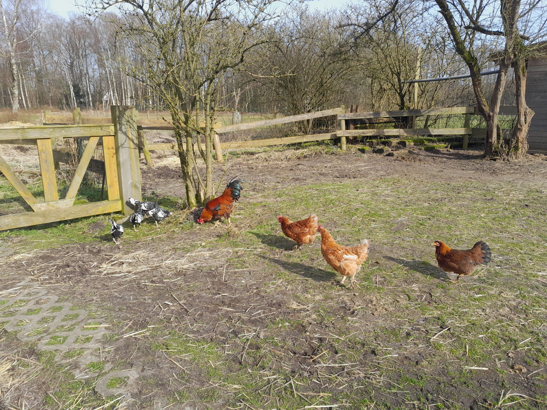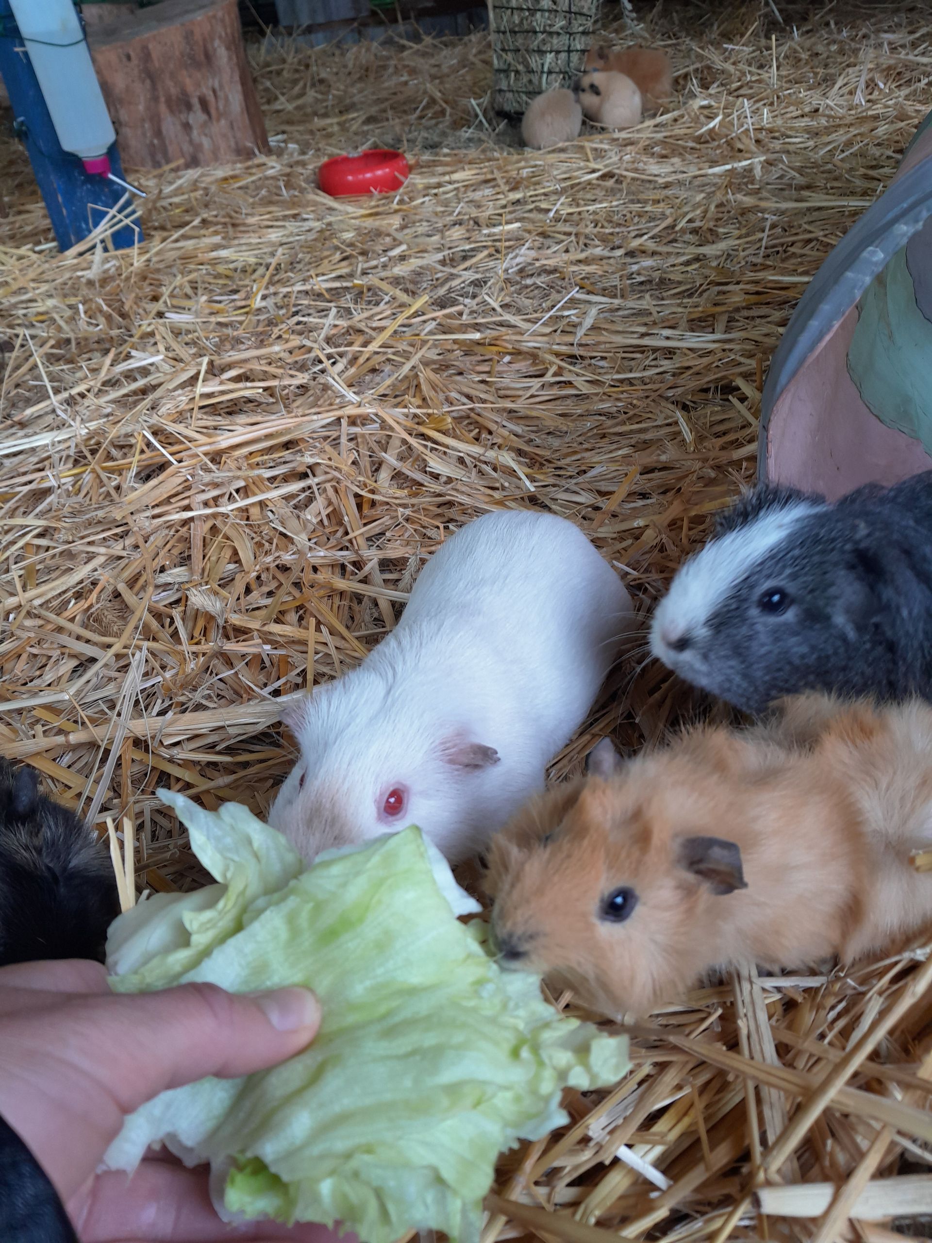 Es sind wieder Meerschweinchen bei uns eingezogen. Und nicht nur das, wir haben auch 9 Hennen und einen Hahn bekommen. Die Gruppe darf tagsüber frei übers Gelände spazieren und sucht sich fleißig die Würmer aus der Erde.